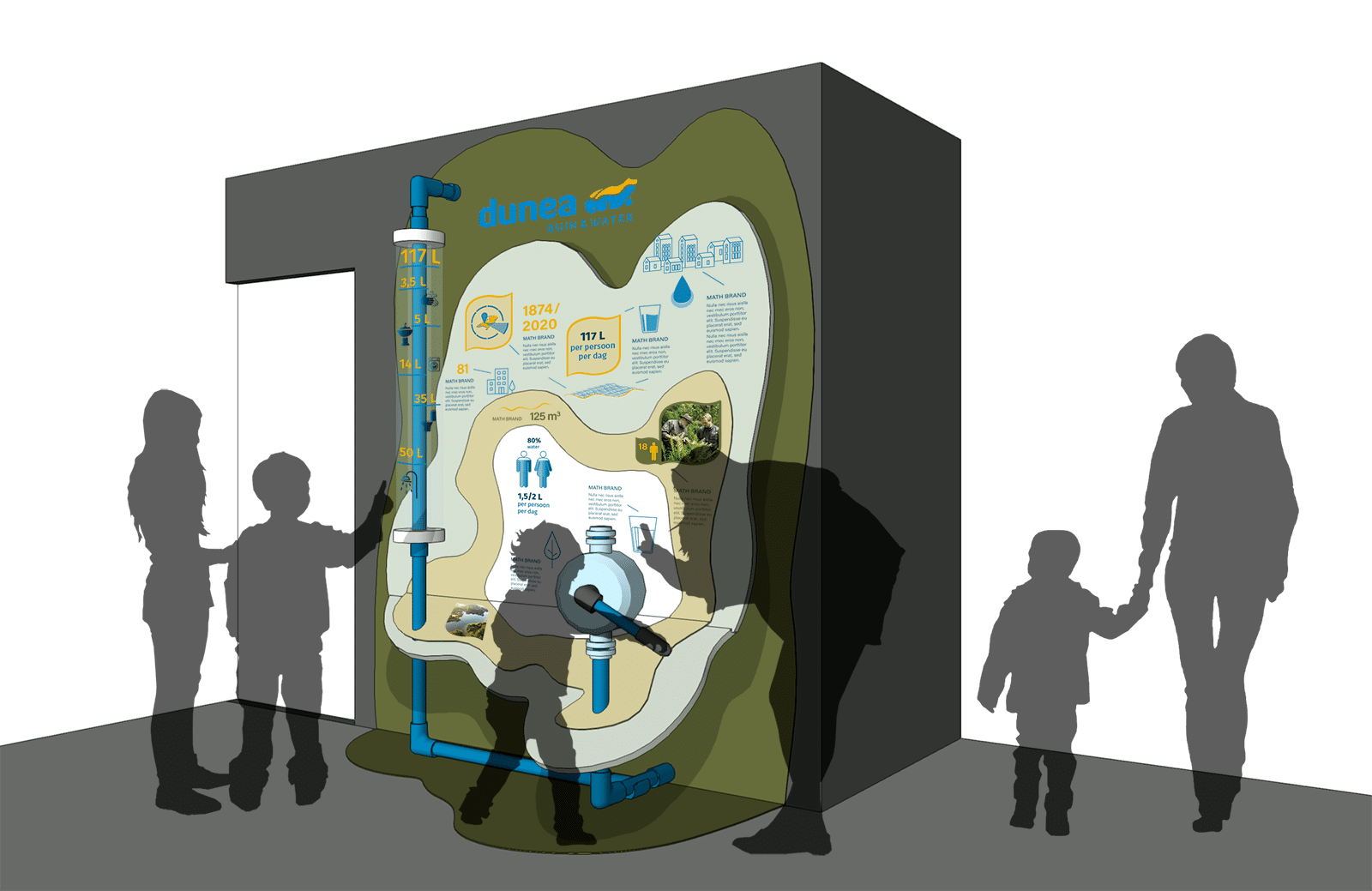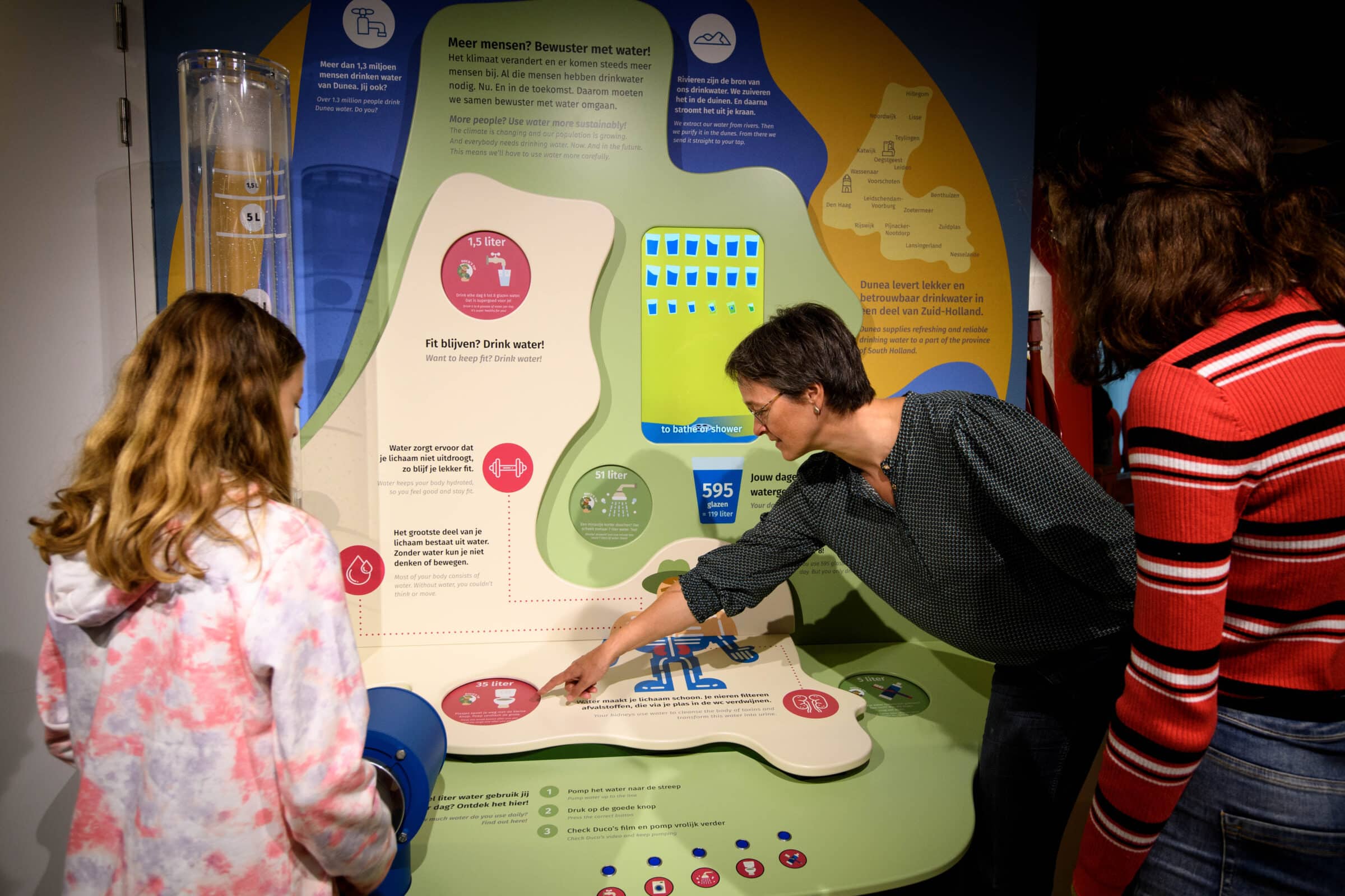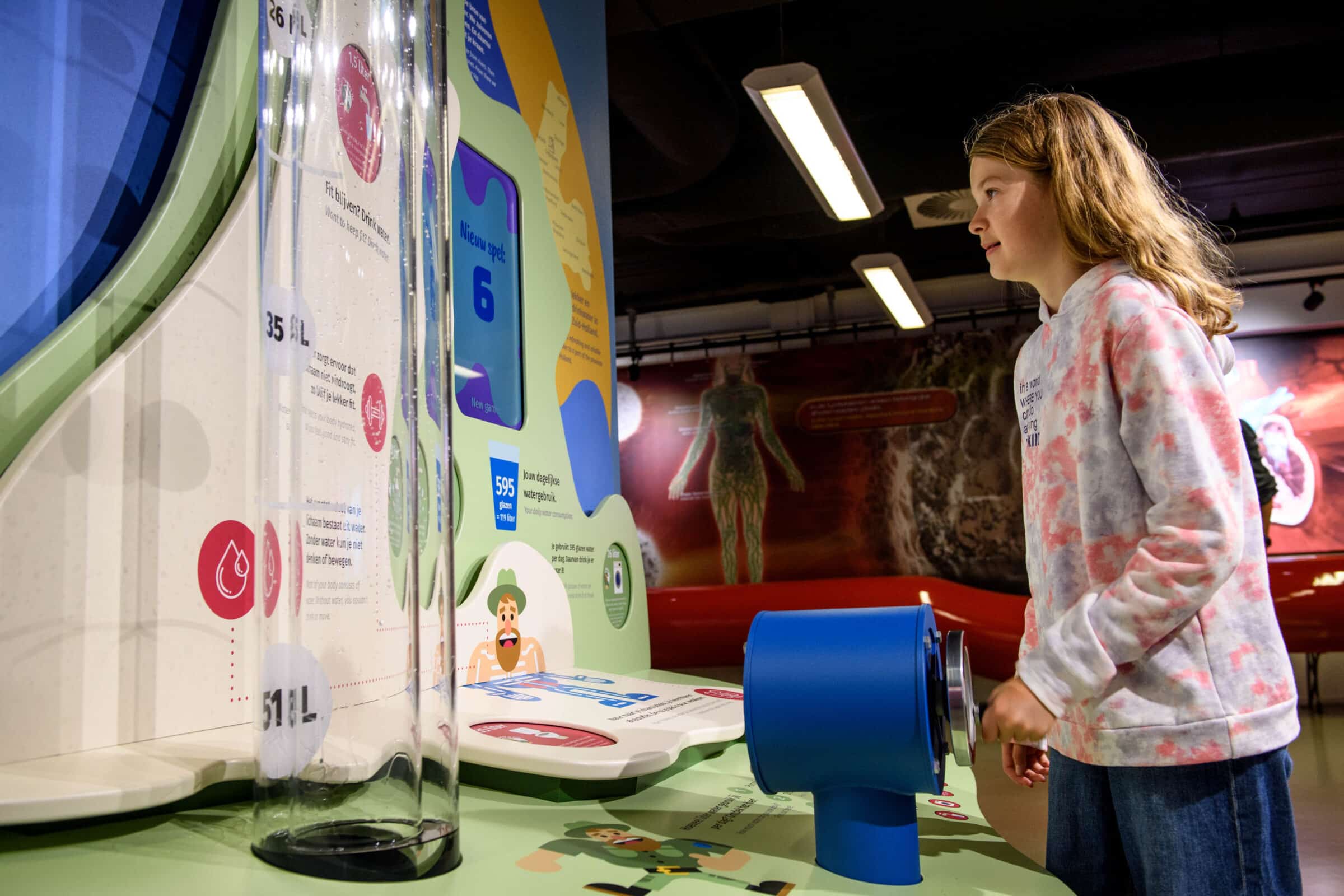 Drinkwater is belangrijk voor de mens, maar wist je dat een gemiddeld mens meer dan 100 liter water per dag verbruikt? Dat gegeven is de basis voor de exhibit. Gezinnen pompen zelf water op en beantwoorden een aantal vragen, zo ontdekken ze spelenderwijs waar al dat water naar toe gaat, en beter nog, waar nog valt te besparen.